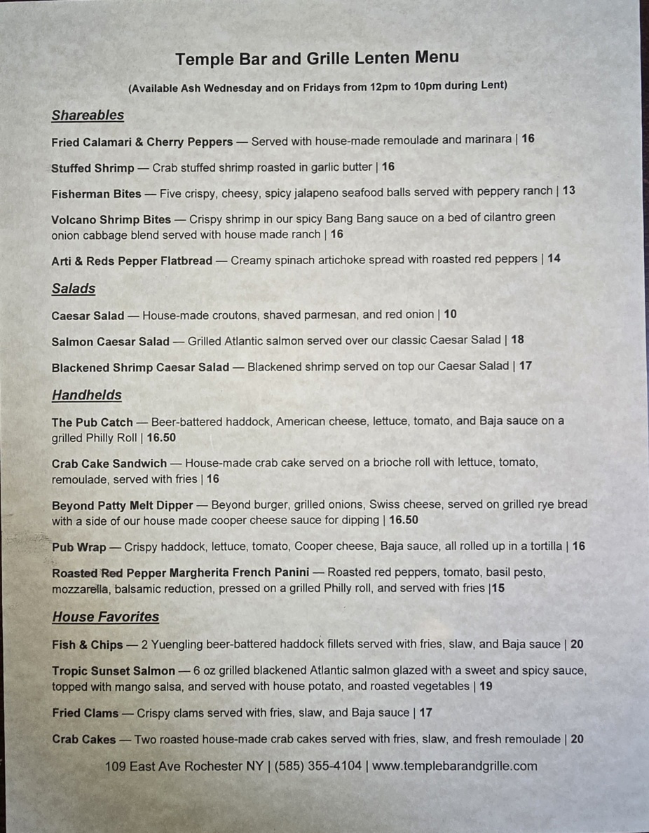 Check out our specials menu that will be served on Ash Wednesday February 18th and Every Friday throughout Lent from 12pm-10pm.