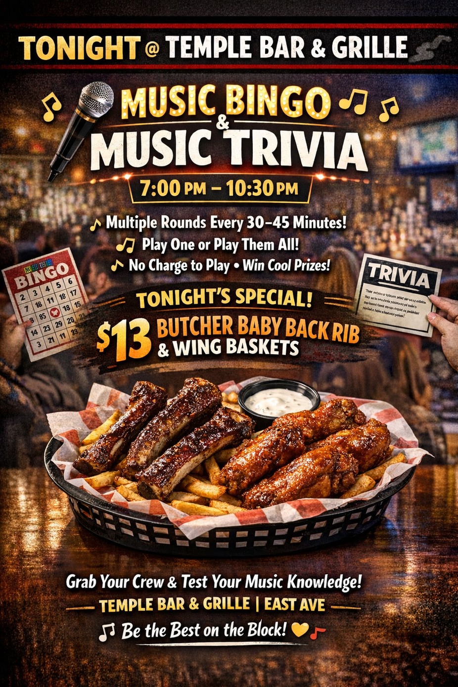 Join us for music bingo and music trivia every Thursday night from 7pm-10pm! Free to play! So many fun playlists to listen to and you can win some cool prizes. Followed by Karaoke until 130am.