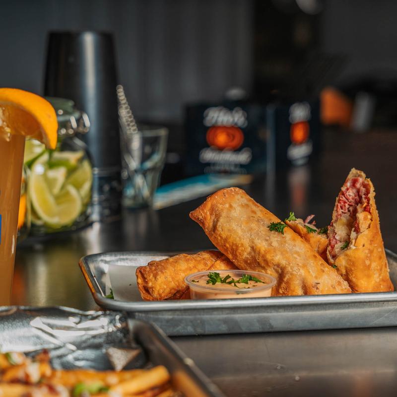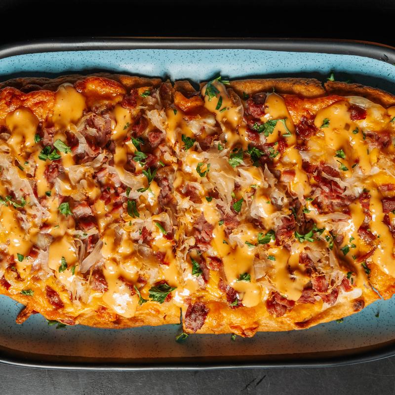 Crispy tots topped with corned beef, sauerkraut, Russian dressing & cheese sauce