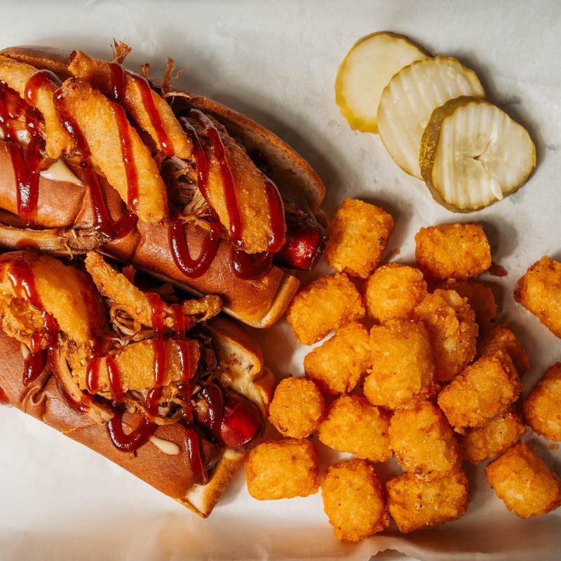 Two crispy fried Sahlen's topped with cheese sauce, pulled pork carnitas, fried onion petals, and BBQ sauce