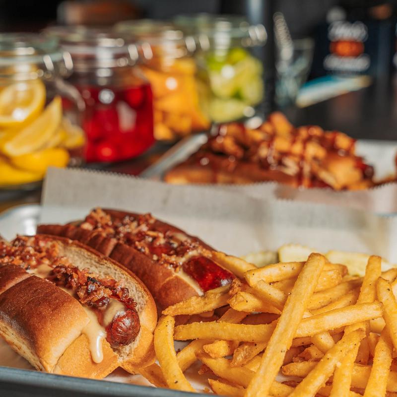 Two crispy fried Sahlen's topped with house cheese sauce and chopped bacon | Add Meat Hot +$1.00