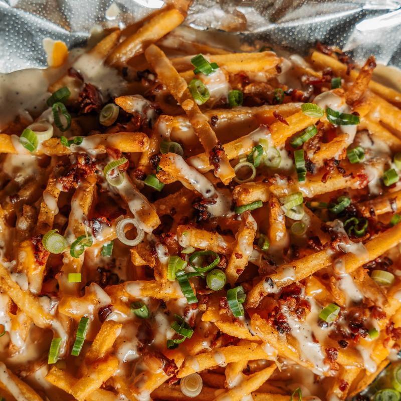 Loaded fries with bacon, cheddar-jack, house cheese sauce, green onions, served with peppery ranch