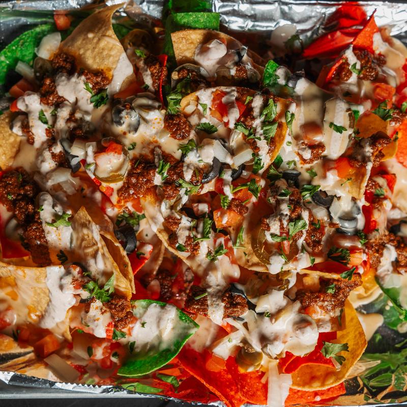 Tortilla chips piled high with cheese sauce, melted blend, onions, olives, tomatoes, jalapeños, tomatillo drizzle | Add Meat Sauce +$2.00