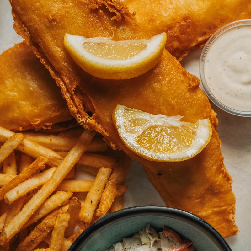 Two Yuengling beer-battered haddock fillets, lemon wedges, fries, slaw, tartar sauce