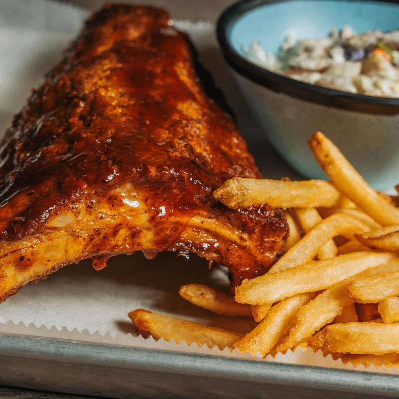 Half rack slow roasted, smoked in-house baby back ribs with BBQ sauce, fries, slaw