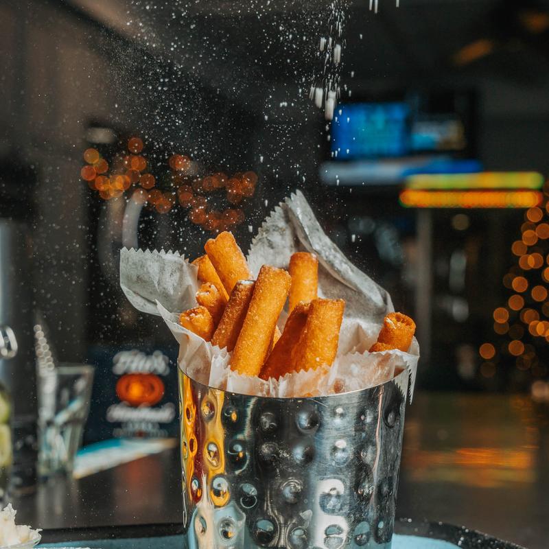 Carnival-style fries dusted with powdered sugar, cream cheese glaze & chocolate sauce