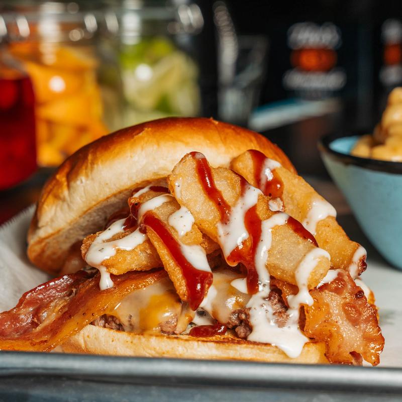 Cajun-seasoned patty, cheese blend, cheese sauce, bacon, pickled jalapeños, topped with hellfire cream sauce